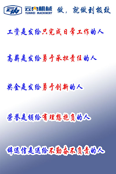 云內(nèi)機(jī)械是一家追求全體員工和合作伙伴精神與物質(zhì)兩方面的滿意和幸福,并致力于為中國制造增光添彩的優(yōu)秀企業(yè), 我們每一個(gè)員工把云內(nèi)機(jī)械當(dāng)做自己的公司,把自己當(dāng)做公司的經(jīng)營者,員工與云內(nèi)機(jī)械是命運(yùn)共同體,忠誠的、勤奮的、 積極的、善于學(xué)習(xí)的、勇于擔(dān)當(dāng)“信使”的員工,是企業(yè)的核心競爭力,是企業(yè)的財(cái)富。員工之間不僅僅是同事關(guān)系,更是 為了同一個(gè)目標(biāo)而共同奮斗的伙伴關(guān)系;我們的合作伙伴,不僅包括設(shè)備廠商、供應(yīng)商、代理商,更包括廣大的終端消費(fèi)者,云內(nèi)機(jī)械與合作伙伴是攜手共進(jìn),風(fēng)雨同舟的命運(yùn)共同體。 我們共同致力于持續(xù)、穩(wěn)健、誠信的生產(chǎn)經(jīng)營,追求業(yè)績的最大化和合理的盈利,我們通過持續(xù)改善產(chǎn)品品質(zhì)、堅(jiān)持提高服 務(wù)水平,不斷提升客戶滿意度。企業(yè)的發(fā)展離不開國家和社會各界的支持,國家強(qiáng)盛為企業(yè)創(chuàng)新和發(fā)展提供良好的平臺,我 們不僅要發(fā)展壯大企業(yè),更要放眼世界,追求技術(shù)創(chuàng)新和產(chǎn)業(yè)升級,為中國制造增光添彩,為中國制造走向世界貢獻(xiàn)力量。