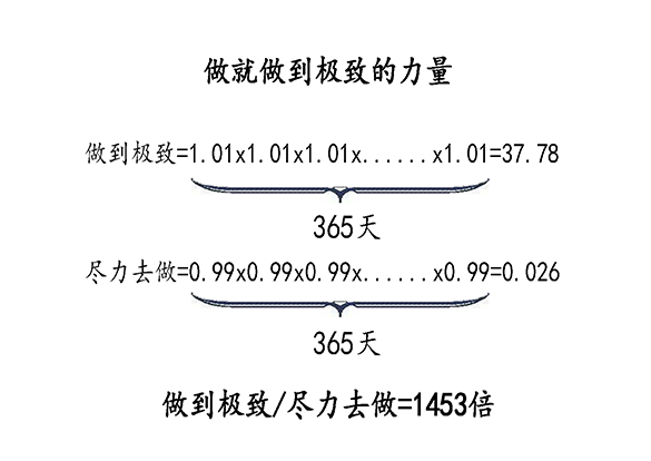 我們倡導(dǎo)員工做任何一件工作,“做,就做到極致”,把事情做細(xì)、做專、做到極致,永遠(yuǎn)以積極的思維方式,滿懷熱情,付出不亞于任何人的努力,把自己的潛能發(fā)揮到極致,人生一定會碩果累累、幸福美滿。